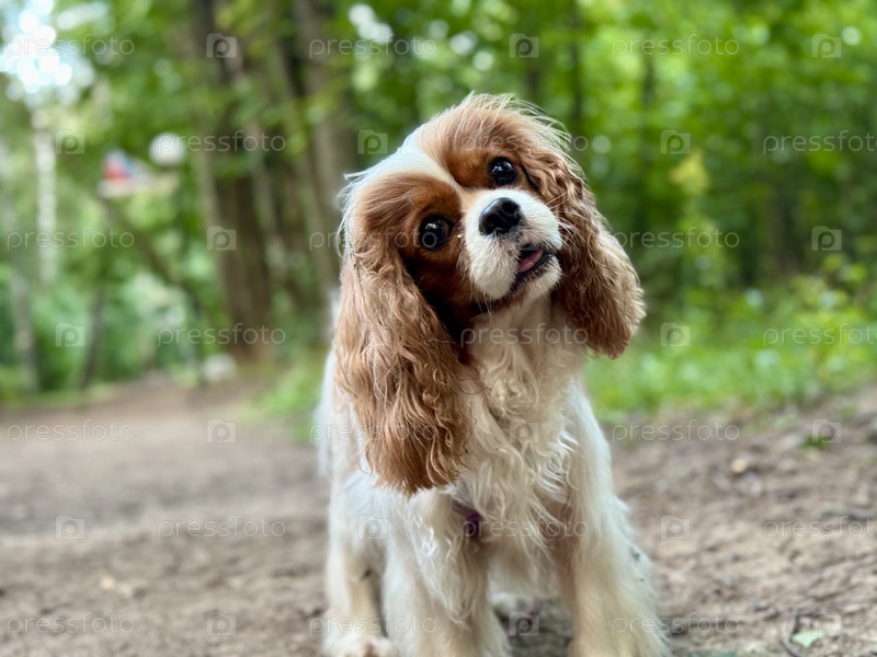 Happy King Charles Spaniel, английский игрушечный спаниель на прогулке летом