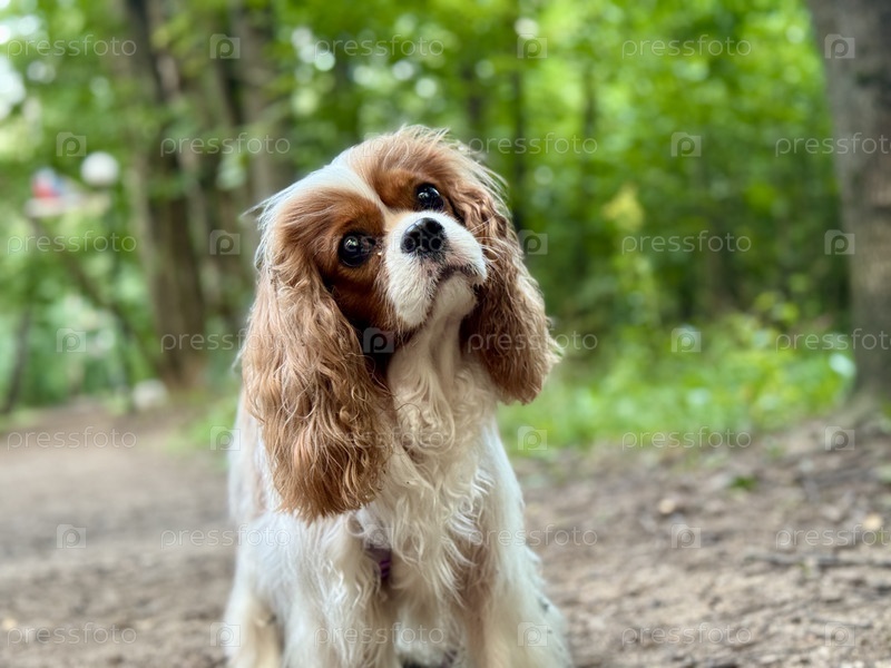 Happy King Charles Spaniel, английский игрушечный спаниель на прогулке летом