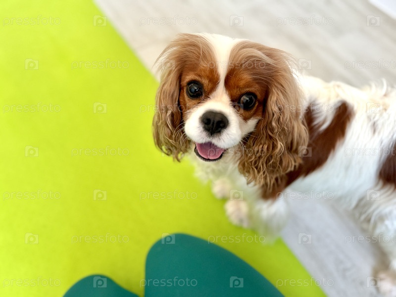 Пет-спаниель короля Чарльза на коврике для йоги со своей любовницей