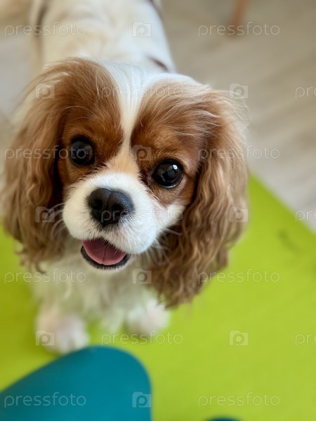 Пет-спаниель короля Чарльза на коврике для йоги со своей любовницей