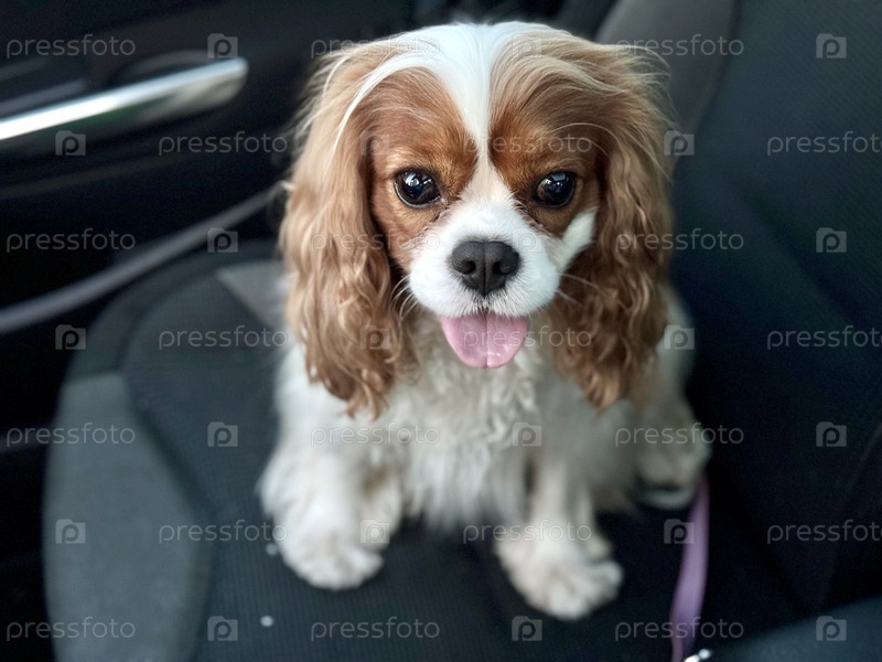 Счастливый спаниель короля Чарльза на переднем сиденье машины готовится к поездке