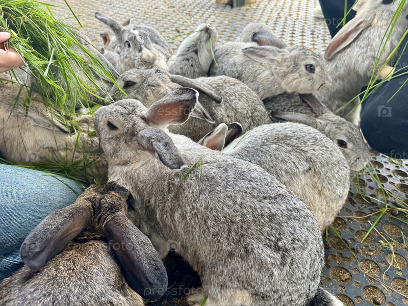 Питание кроликов свежей травой на ферме летом