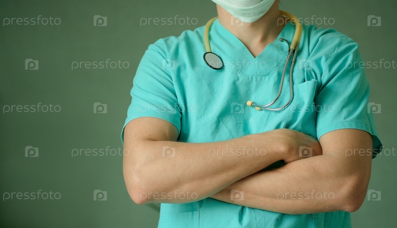 Близкий план опытного врача-мужчины в медицинской маске и стетоскопе, стоящего со скрещенными руками. Концепция здравоохранения, профессионализм медицины, доверенный клинический персонал