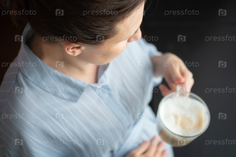 Беременная женщина держит горячий кофе, отдыхая дома.Современный подход к умеренному потреблению кофеина во время беременности