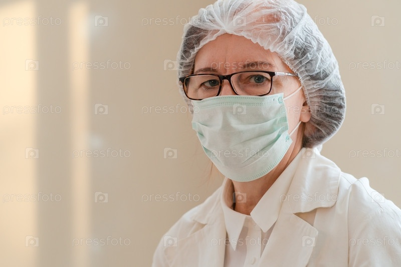 Портрет взрослой женщины-врача с медицинской маской.Ее усталые глаза отражают истощение, преданность и человеческую сторону долгосрочной работы в области здравоохранения