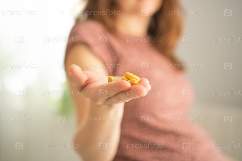 Близкий снимок руки матери, держащей рецептурную таблетку, в то время как другая рука защищает ее беременный живот