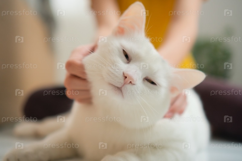 Близкий план удовлетворенной белой кошки, получающей любящих домашних животных, дрожащих от мурлыкания.Теплый показ доверия к животным и человеческой привязанности