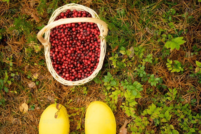 Осенний лес с клюквенной корзиной и резиновыми сапогами вид сверху