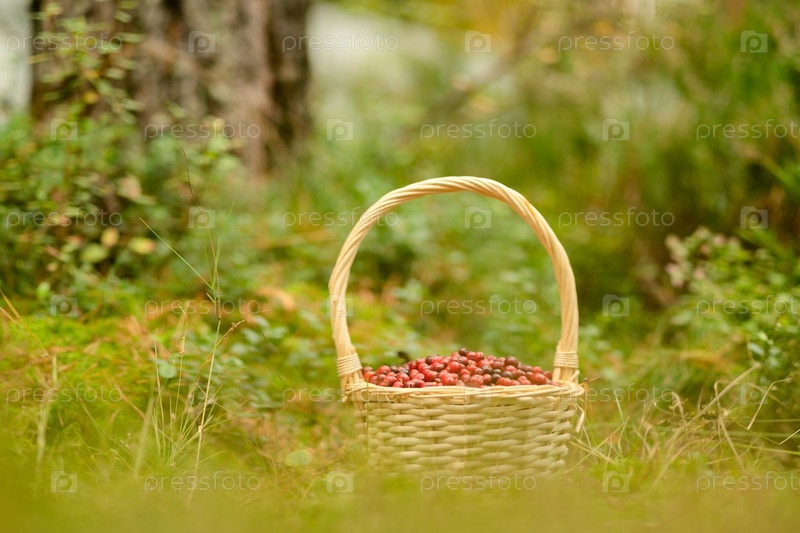 Полная корзина клюквенных на лесном грунте.Осенний урожай, лесные подарки, полезные ягоды, натуральные витамины, красные фрукты для варенья и напитков, сказочный пейзаж, спокойная погода, спокойное настроение