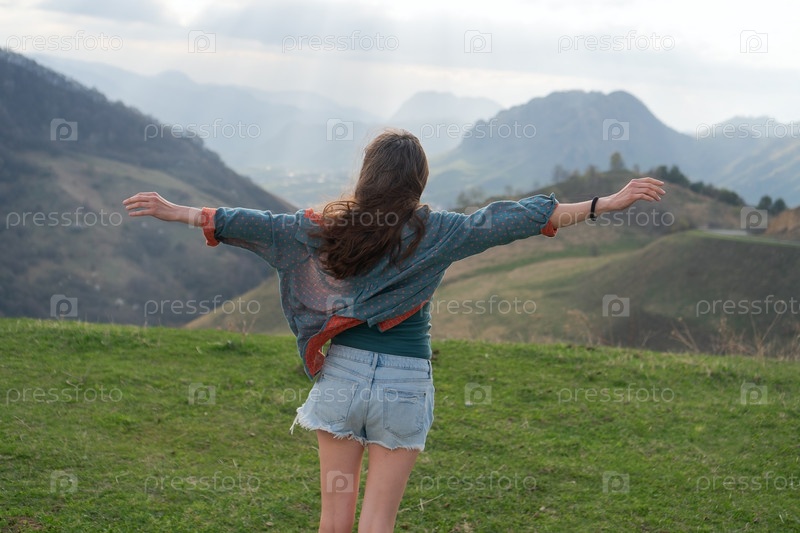 Женщина, обнимающая природу на горной скале