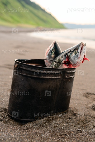 Кулинарный горшок на открытом воздухе с только что пойманным розовым лососем на удивительном фоне туманных гор и песчаного пляжа