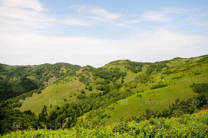 Потрясающий вид на зеленые горные хребты под голубым небом. идеально подходит для походов, путешествий и концепций природы
