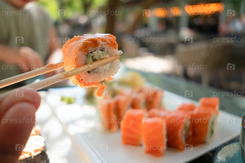 Апетитный рулон суши, наполненный свежим лососем и хрустящим огурцом, захваченным в воздухе палочками перед рестораном