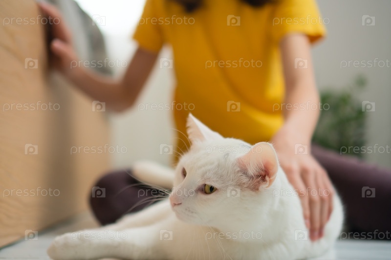 Плодородная белая кошка довольна тем, что отдыхает в объятиях девочки-подростка.Мирная сцена взаимного доверия и общения с домашними животными