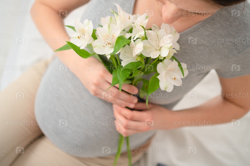 Беременная женщина в сером держит букет лилий, нежно поглаживая своего ребенка, символизируя материнство и ожидание