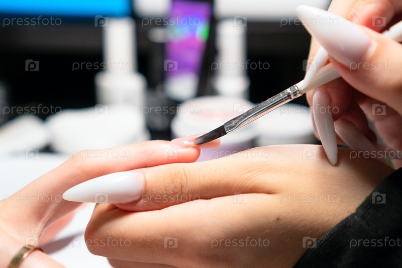 Профессиональный маникюр тщательно наносит гелевой лак во время процедуры удлинения ногтей, обеспечивая идеальное однородное покрытие и форму