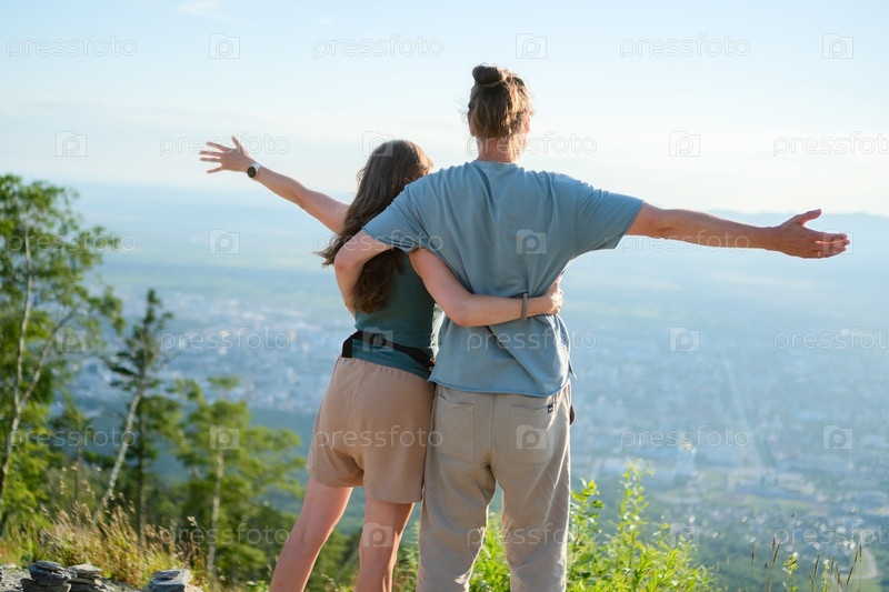 Пара пешеходов гуляет на заднем плане, обнимаясь с Cityscape Panorama