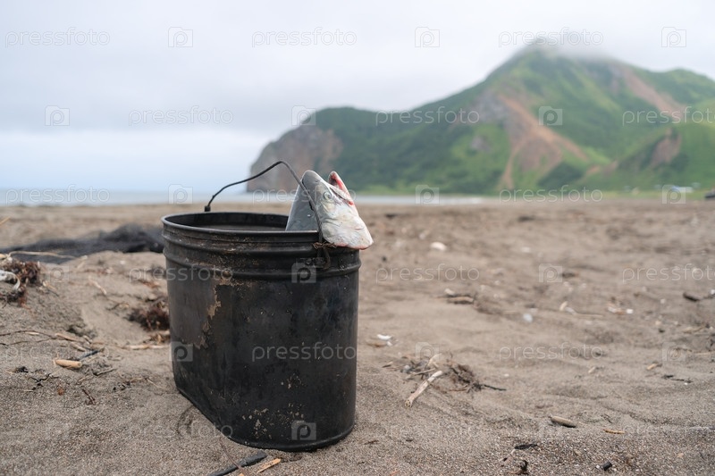 Кулинарный горшок на открытом воздухе с только что пойманным розовым лососем на удивительном фоне туманных гор и песчаного пляжа