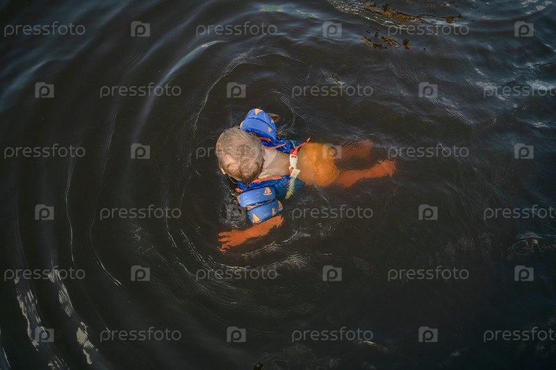 Над головой снимок счастливого малыша, плавающего в одиночку с плывущими повязками в глубоководных водоемах озера, наслаждаясь безопасными летними водными мероприятиями