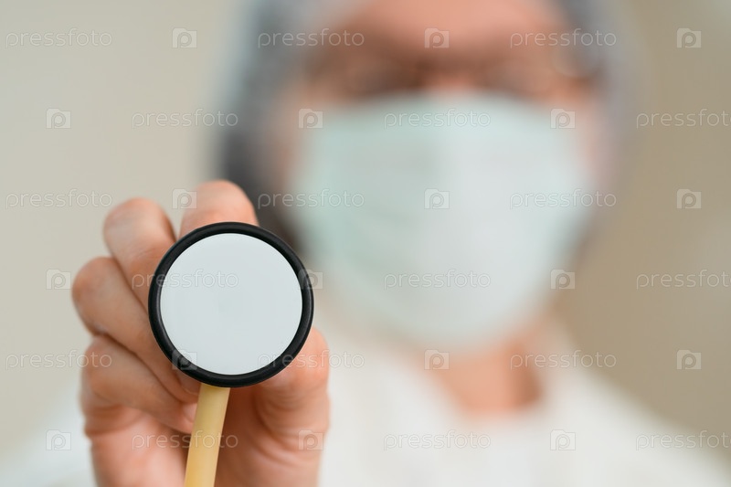 Закрытие женщины-врача в белом пальто и медицинской маске с диафрагмой стетоскопа.Фокусируйтесь на аускультации легких, диагностике, пневмонии, бронхите и здравоохранении