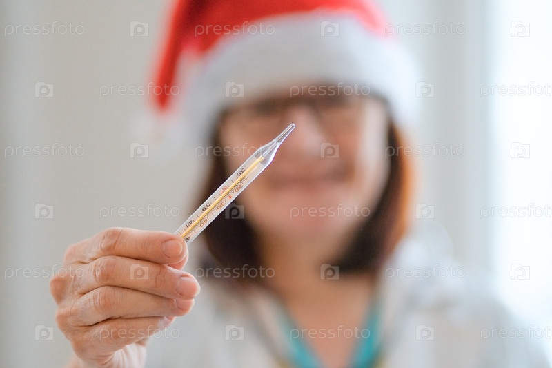 Улыбающаяся врач в Санта-Хат с термометром