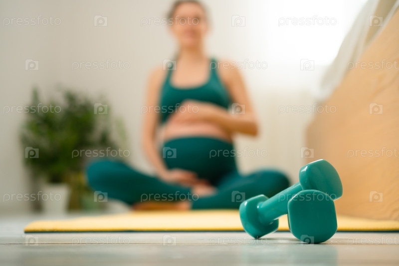 головоломки в фокусе, беременная женщина растягивается или занимается йогой на заднем плане. спокойный фитнес-программа во время беременности
