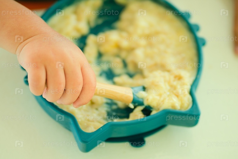 Вид детской руки со ложкой в питательной каше, захватывающий важный этап отлучения и ранние независимые навыки еды