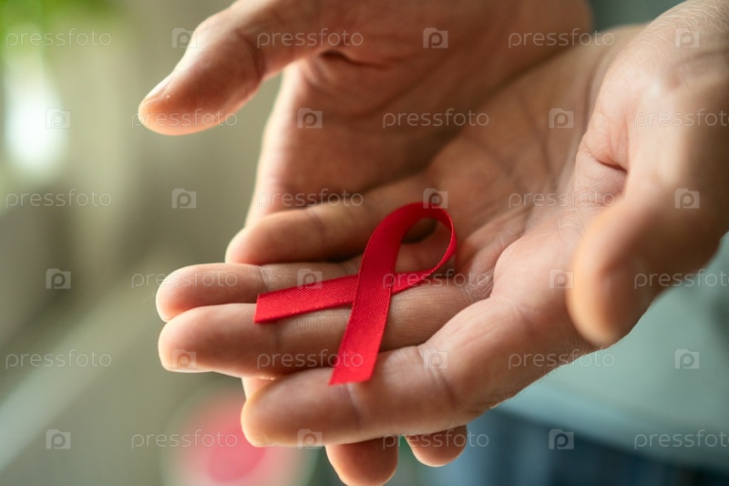 Люди открывают руки, чтобы показать красную сатинную ленту, символизирующую осведомленность о ВИЧ/СПИДе, поддержку пострадавших и надежду на декабрь
