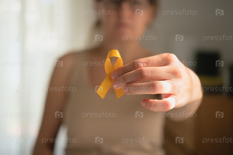 Подробный снимок руки матери, держащей желтую ленту осведомленности, символизирующую надежду и солидарность с семьями, столкнувшимися с детским раком
