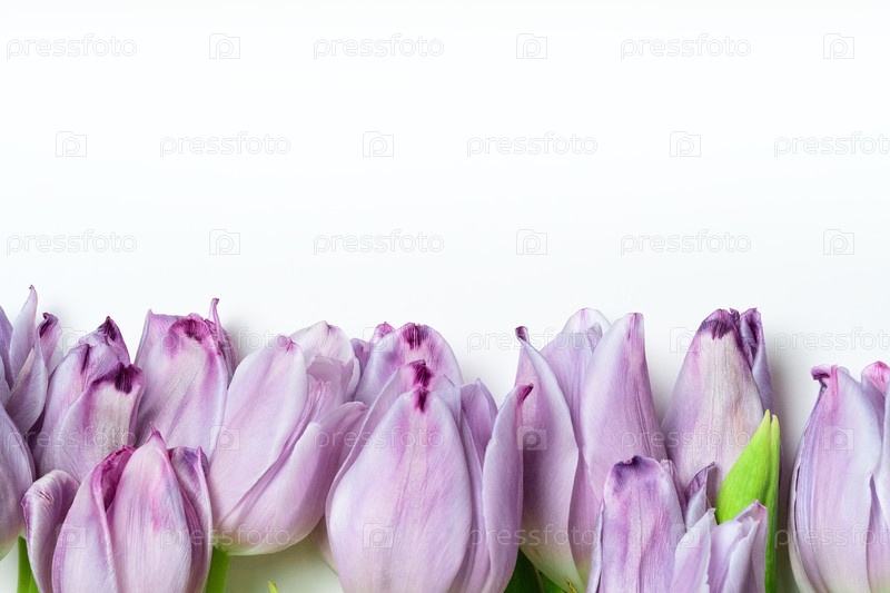 Красивые фиолетовые тюльпаны в полном цветении, изящно расположенные на чистом белом фоне. Цветовая рама добавляет тонкий оттенок. Идеально подходит для весенних тем, обоев и дизайнов, вдохновленных природой