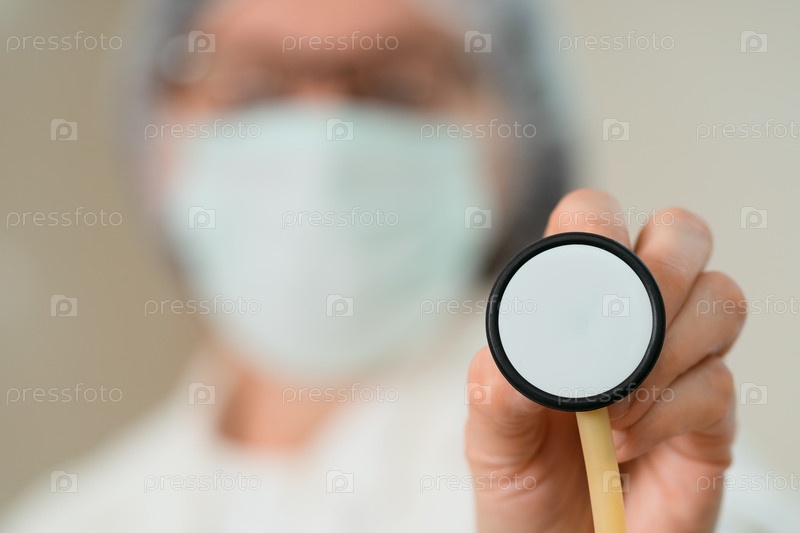 Женщина-врач в маске и белом пальто наносит стетоскопическую диафрагму для аускультации легких.Фокусируйтесь на диагностике заболеваний дыхательных путей, пневмонии и бронхита