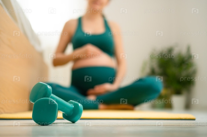 Сосредоточенный взгляд на гантели с беременной женщиной, занимающейся йогой на заднем плане.Гармония силы и спокойствия
