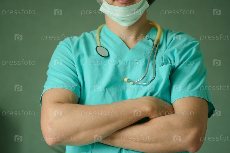 Близкий план врача-мужчины в защитной маске и стетоскопе, стоящего со скрещенными руками