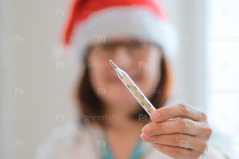 Доктор Санта-Хэт держит термометр в больнице