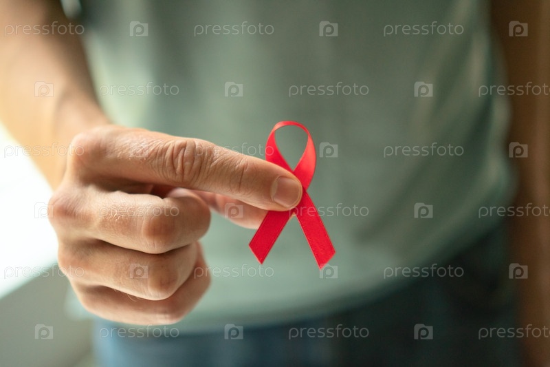 Руки человека с красной лентой на Всемирный день борьбы со СПИДом