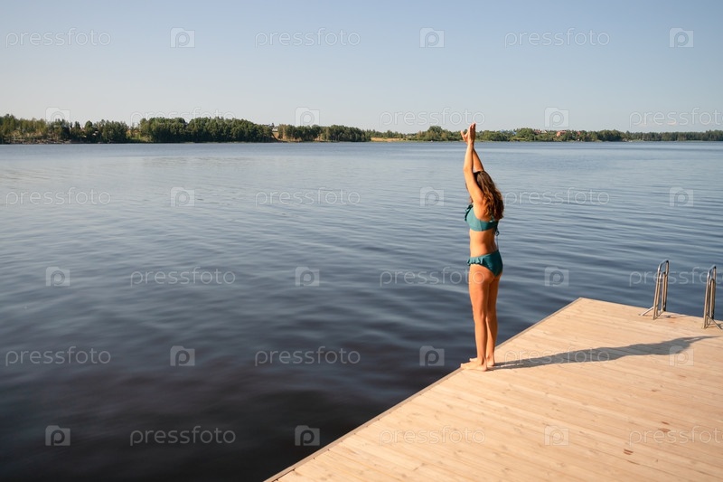 Молодая женщина в купальнике поднимает руки перед погружением с деревянного пирса в спокойное озеро, захватывая момент свободы, радости и связи с природой