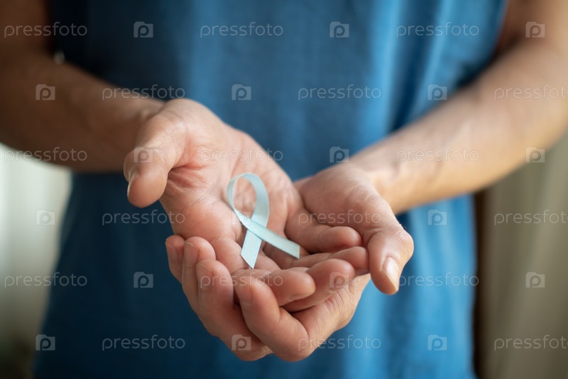Закройте человека, держащего в руке синюю сатинную ленту - символ ноябрьской кампании по информированию о раке предстательной железы, диагностике, лечению рака и поддержке семьи и близких