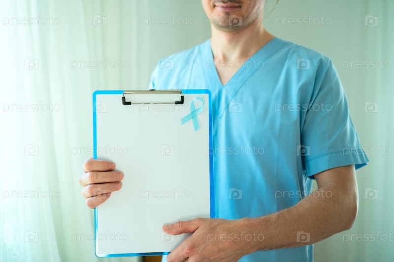 Покройте молодого медицинского работника синей атласной лентой и пустой доской.Ноябрьская концепция повышения осведомленности, профилактики и диагностики рака простаты