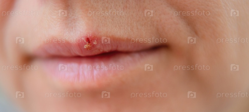 Закройте губы женщины, показывая пузыри герпеса, вызванные холодом или стрессом.Баннерная концепция болезни, осведомленности о здоровье и личной гигиене