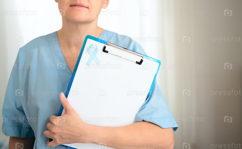 Женщина-медицинский работник с книжной доской и синей лентой
