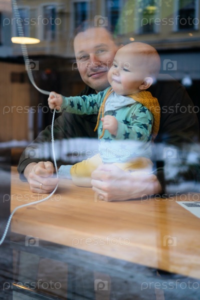 Родитель и ребенок в кафе смотрят сквозь стекло