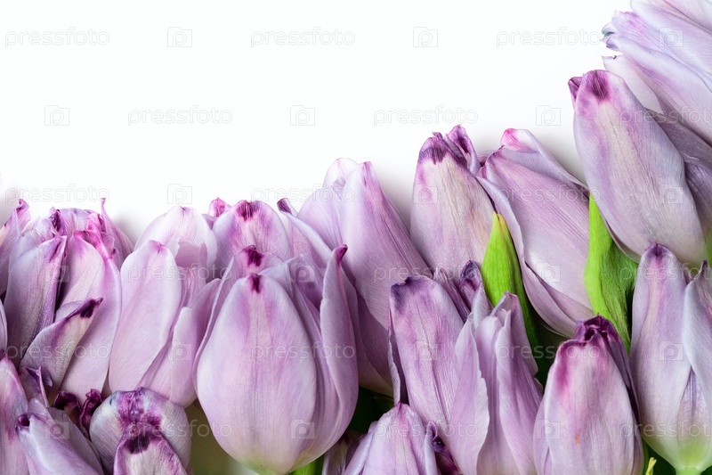 Красивые фиолетовые тюльпаны в полном цветении, изящно расположенные на чистом белом фоне. Цветовая рама добавляет тонкий оттенок. Идеально подходит для весенних тем, обоев и дизайнов, вдохновленных природой