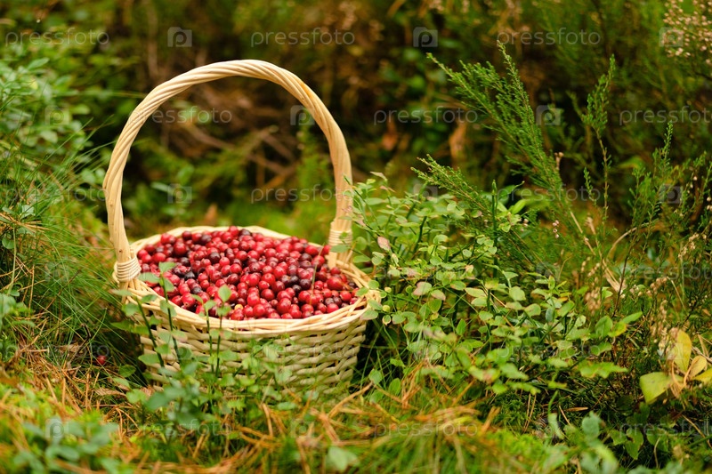 Корзина с красными клюквами в окружении осеннего леса. полезные ягоды, витамины, здоровый урожай, дары леса, прогулки по природе, свежий воздух, тихие леса, разноцветная лиственница, красивая осенняя сцена