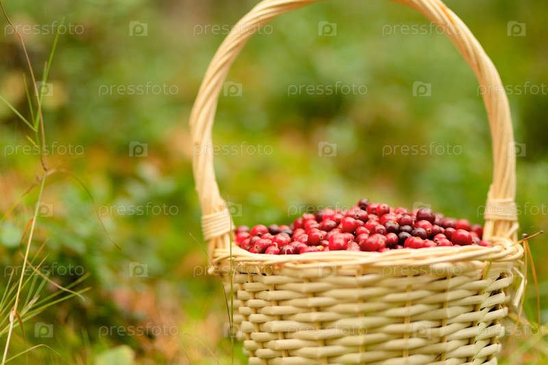 Закройте полную корзину с спелыми клюквенными среди осенних листьев. лесные дары, натуральные витамины, ягоды для варены, здоровая еда, прогулки по красочному лесу, спокойное осеннее настроение, красивые леса