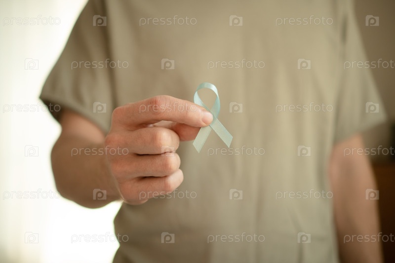 Мужчина держит синюю ленту для повышения осведомленности о раке простаты в ноябре