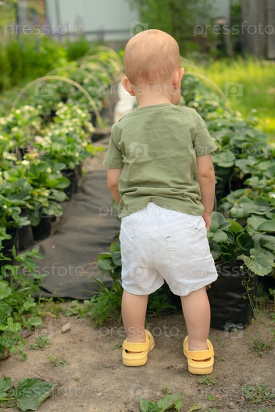 Adventure baby исследует клубниковые растения и вкушает свежие ягоды. радостный момент здорового питания и сенсорных открытий