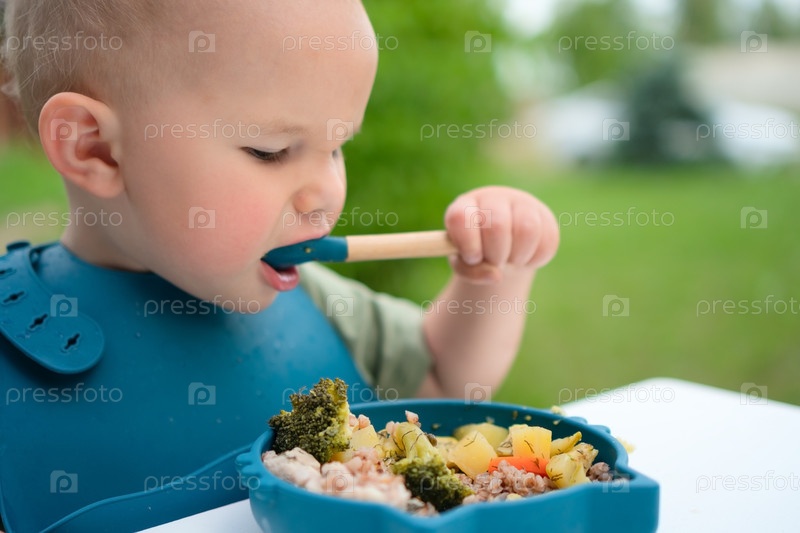 Ребенок кормит себя овощным пюре в солнечный день.Первые кусочки полны любопытства и аппетита