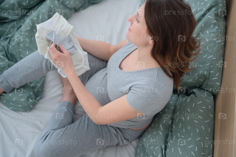 Женщина-ожидательница в позе лотоса аккуратно складывает на кровать одежду новорожденного, теряясь в радостных мыслях о материнстве. Теплая, спокойная атмосфера. Вид сверху