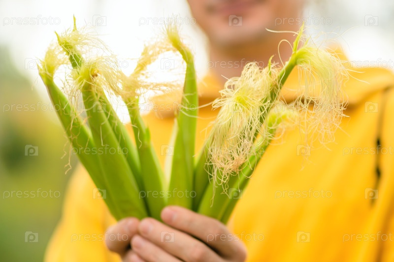 Свежая кукуруза в руках мужчин, символ урожая и тяжелого труда.Органическая пища, домашнее хозяйство, сельское хозяйство и здоровое сельское питание
