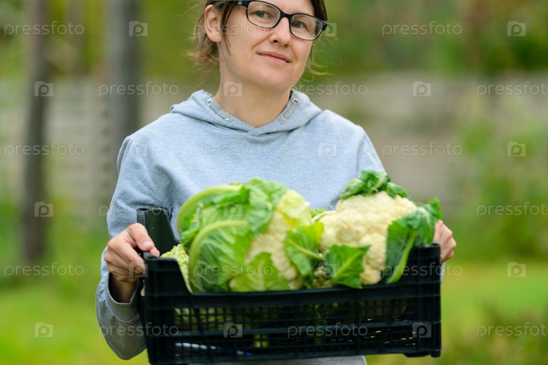 Женщина-фермер с свежей культурой цветной капусты на органической ферме